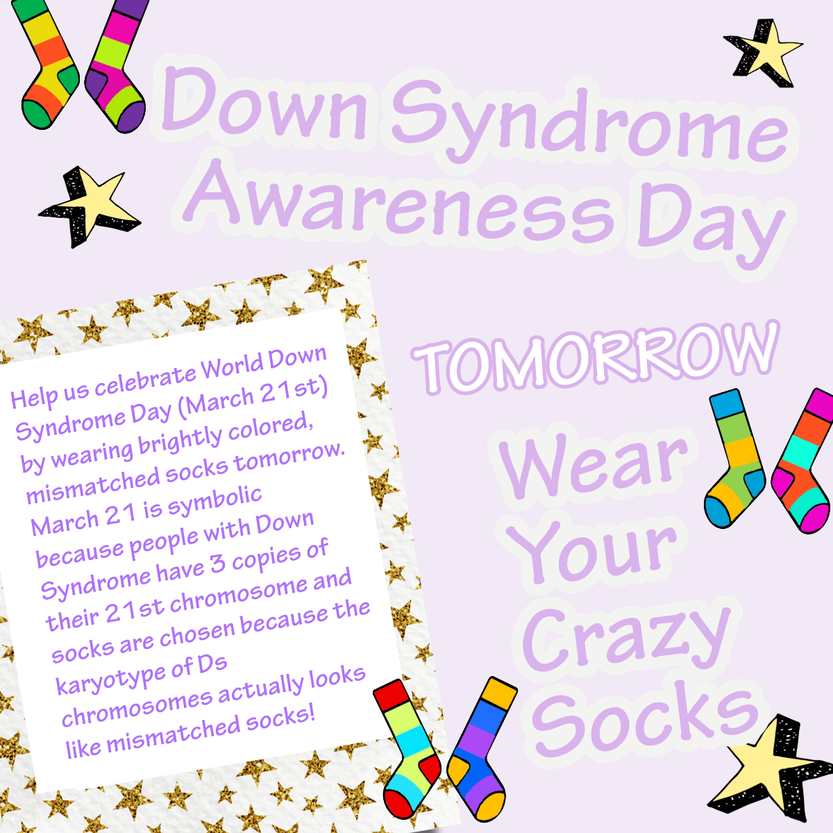 Why the crazy socks? Because chromosomes look a bit like socks, and people with Down syndrome have an extra one! We wear our brightest, wildest, and most mismatched socks to celebrate everything that makes our friends and family with Down syndrome unique and wonderful.